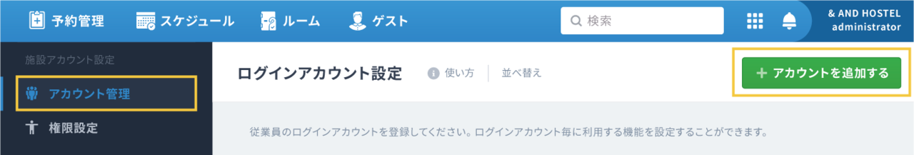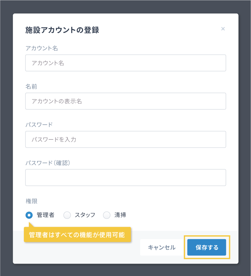 施設で使用するアカウントを、複数作成することができます。 また、アカウント毎に、操作できる機能に制限を設けることも可能です。
