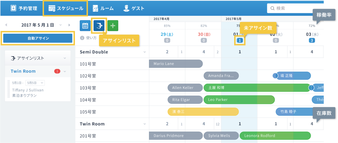 アサインリストボタン、あるいは日付の下の数値ボタンをクリックすると、画面左側にアサインリストが表示されます。