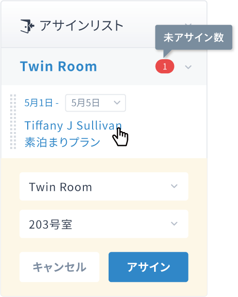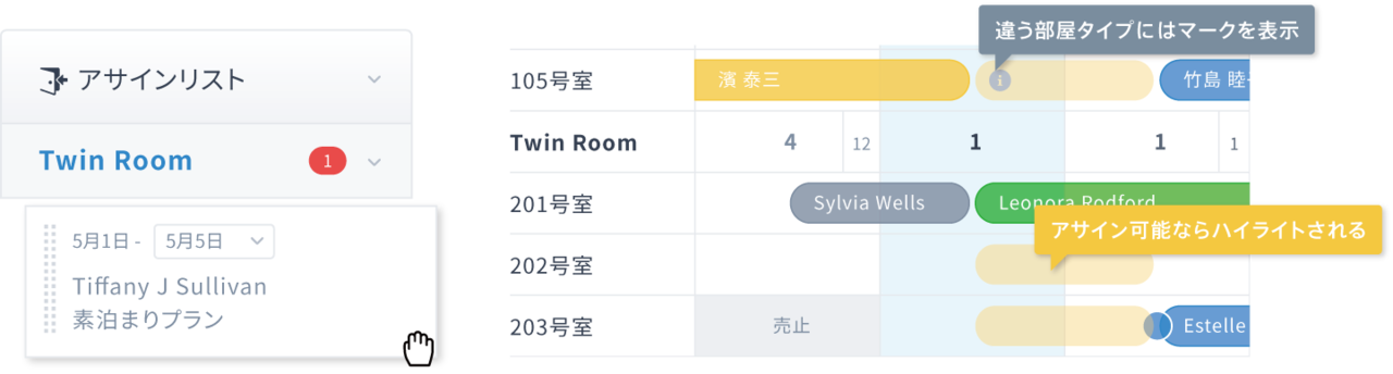 予約とは違う部屋タイプにアップグレードする、在庫の関係上特別に違う部屋タイプにアサインするなど、違う部屋タイプへのアサインも楽に行うことができます。