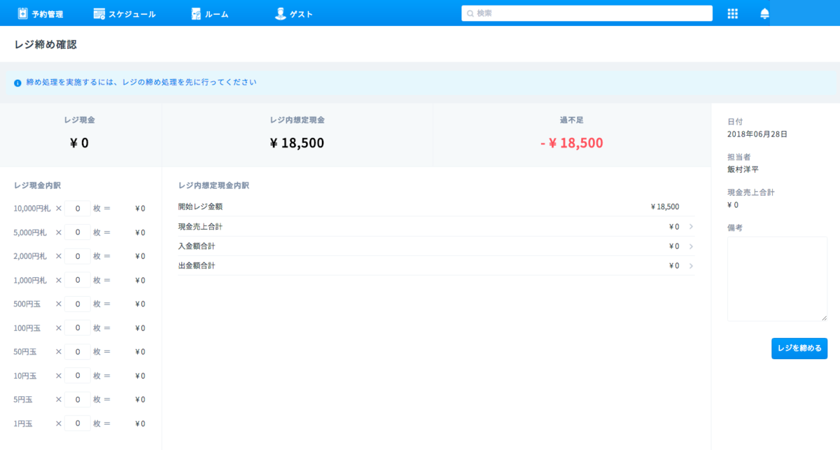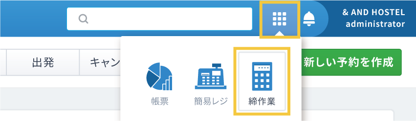 チェックアウト対応や売上金の確認などが終わり、次の営業日を迎えるには、締作業をして業務日付を変更する必要があります。締作業をして業務日付を変更しないと、チェックインやチェックアウトができなくなります。
