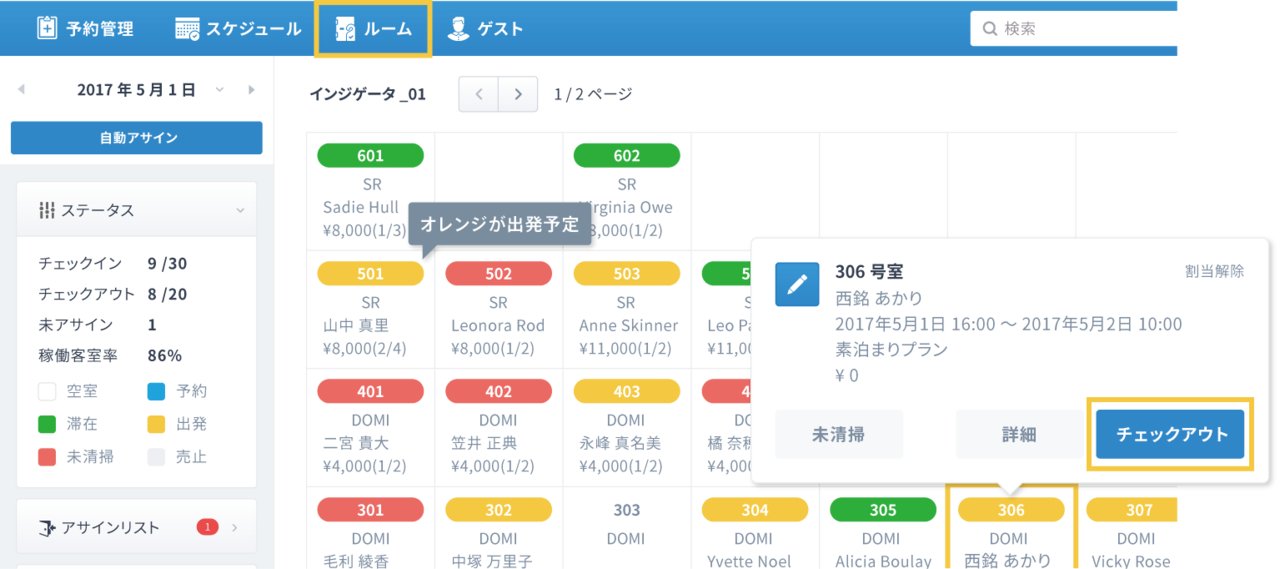 入金科目を選択して、精算することでチェックアウト処理も行うことができ、未清掃に状態が変更します。