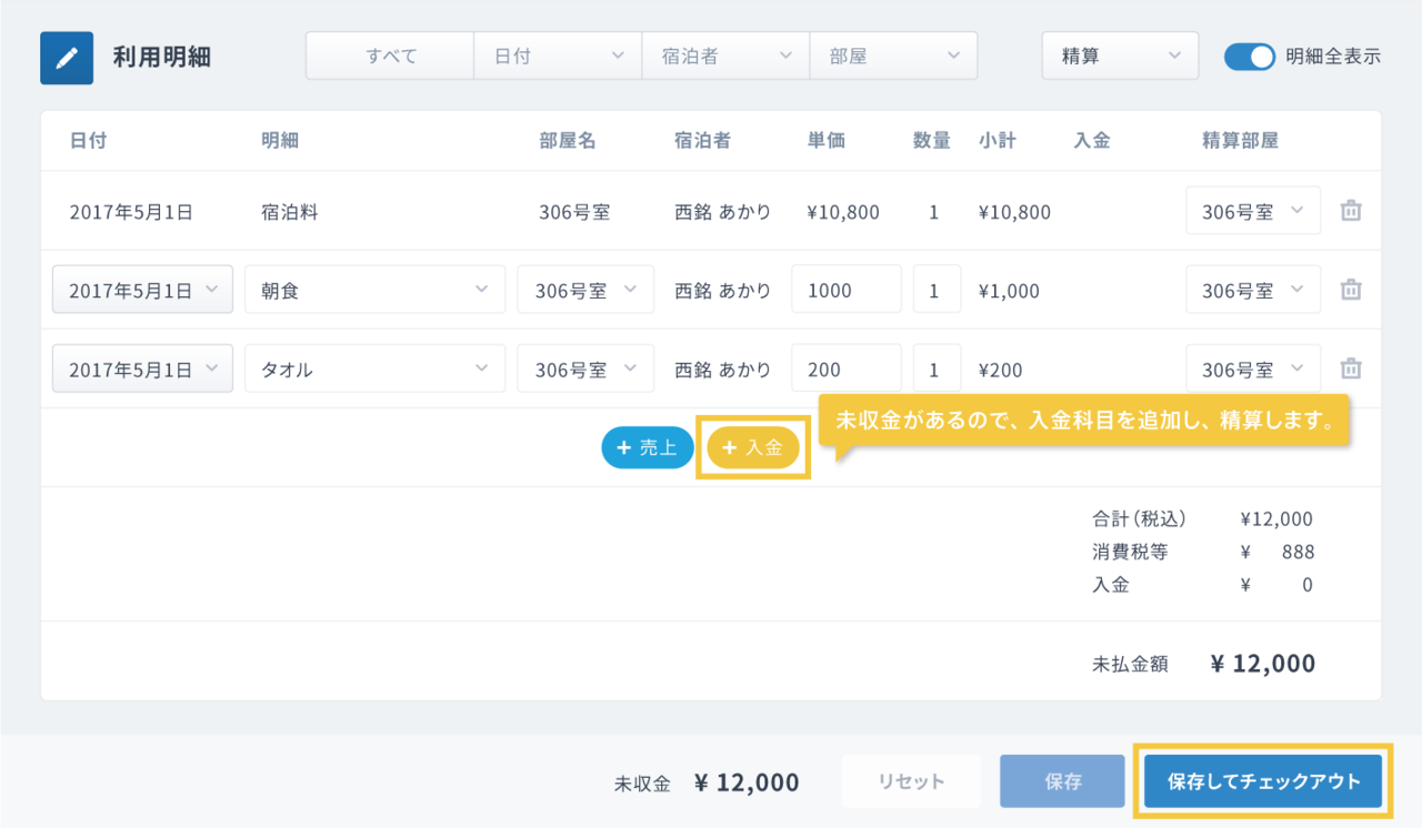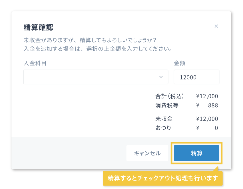 未収金がある場合に、入金科目を追加する前に、保存してチェックアウトを押すと精算確認画面が表示されます。