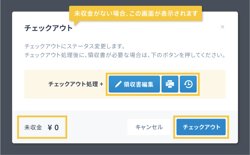 確認画面が表示されます。チェックアウトと領収書発行を連続で行うことも可能です。チェックアウト後は未清掃に状態が変更されます。