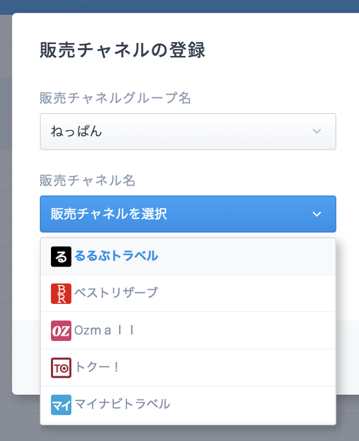 販売チャネルグループ名で「ねっぱん」を選択すると、Booking.com, Expedia, などの各OTA(Online Travel Agent)名称から販売チャネルを選択できるようになります。