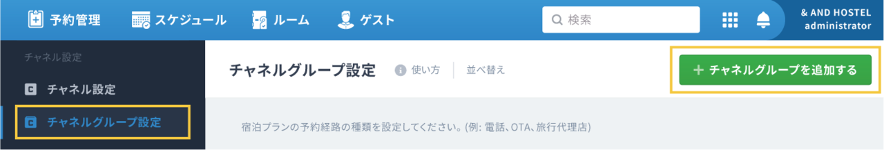 チャネル(予約経路)をまとめるグループを登録します。