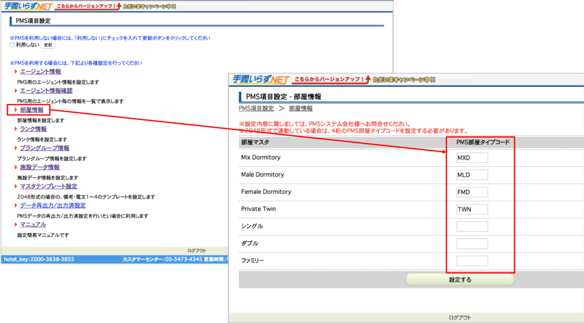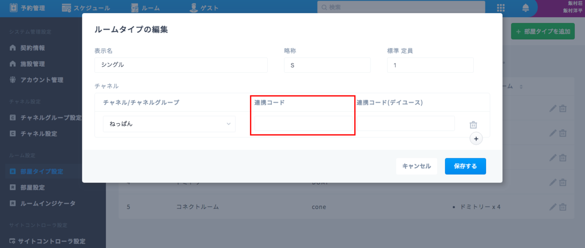 手間いらずの「部屋情報」の「PMS部屋タイプコード」を設定してinntoに連携