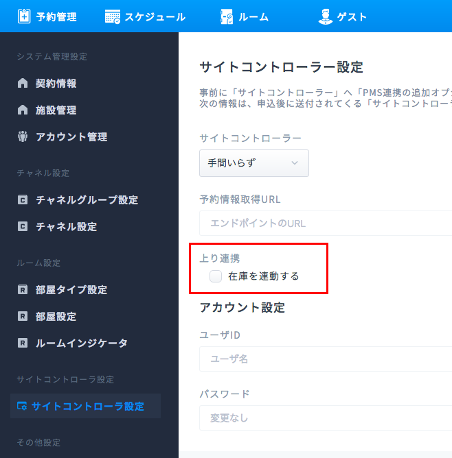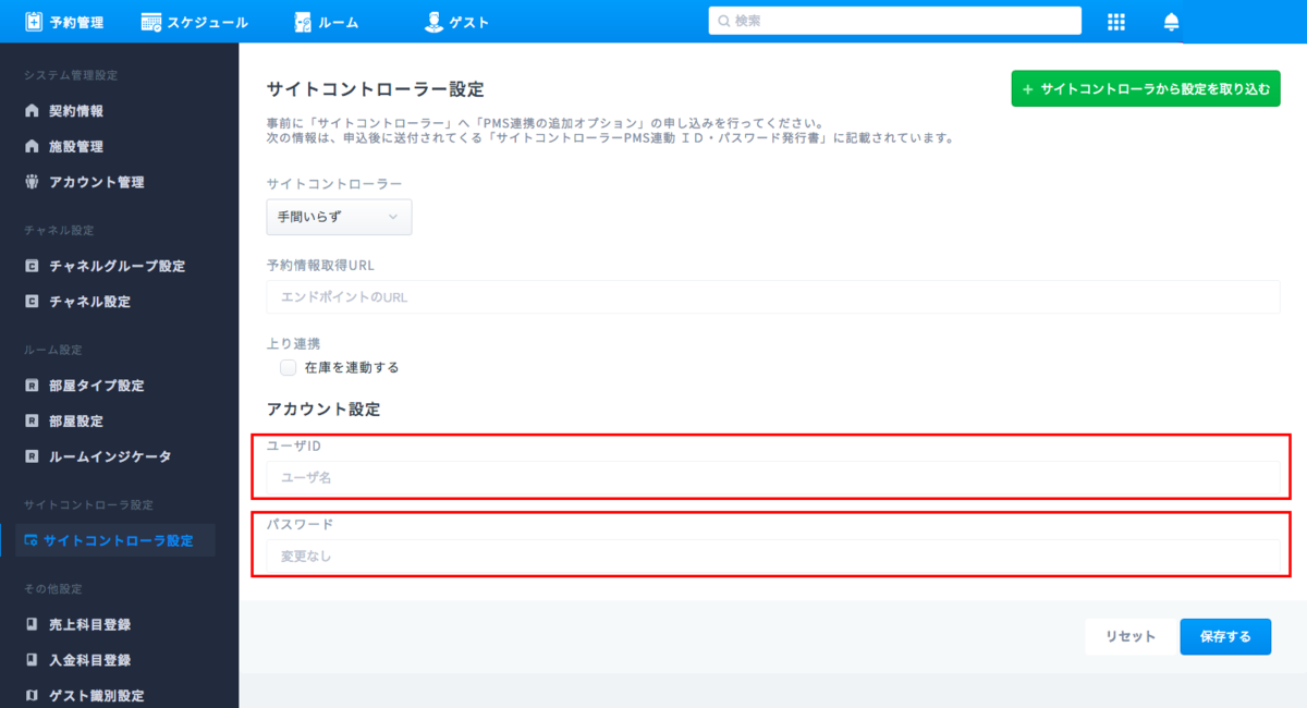 「手間いらず」の管理画面の「PMS連携用アカウント」のID・パスワード情報をinntoの設定画面から入力して下さい。