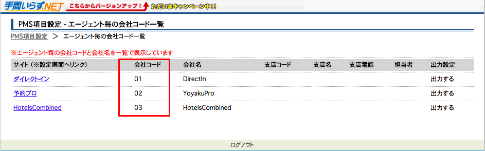 「エージェント情報」設定画面から予約サイトを選択し、それぞれの「会社コード」を設定して下さい。