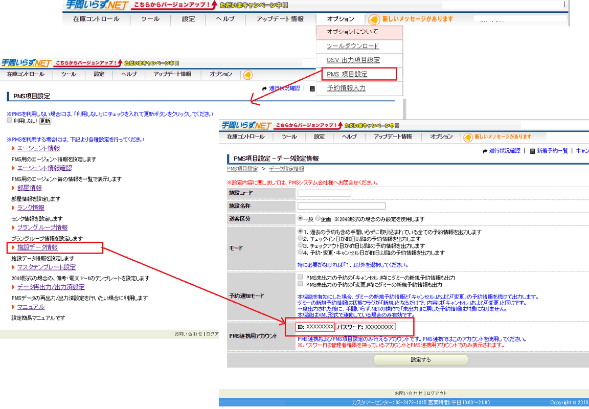 まずは、施設様で利用されている「手間いらず」の管理画面から「PMS 連携機能」の申し込みをお願いします。
