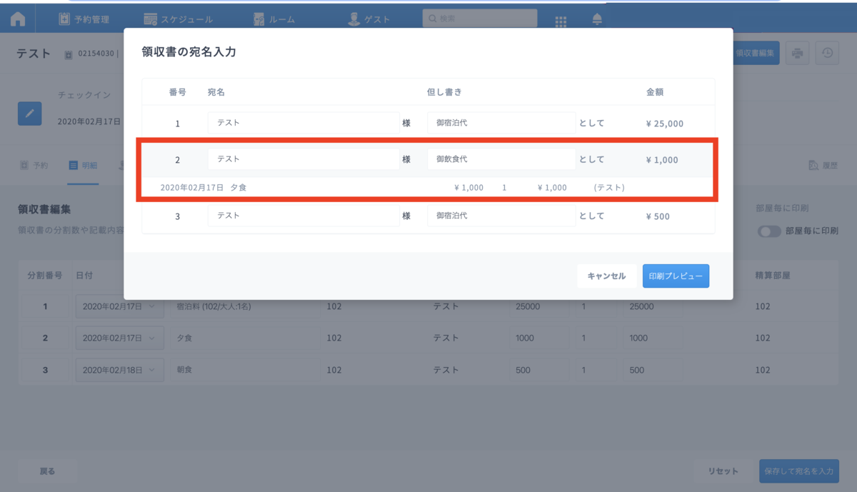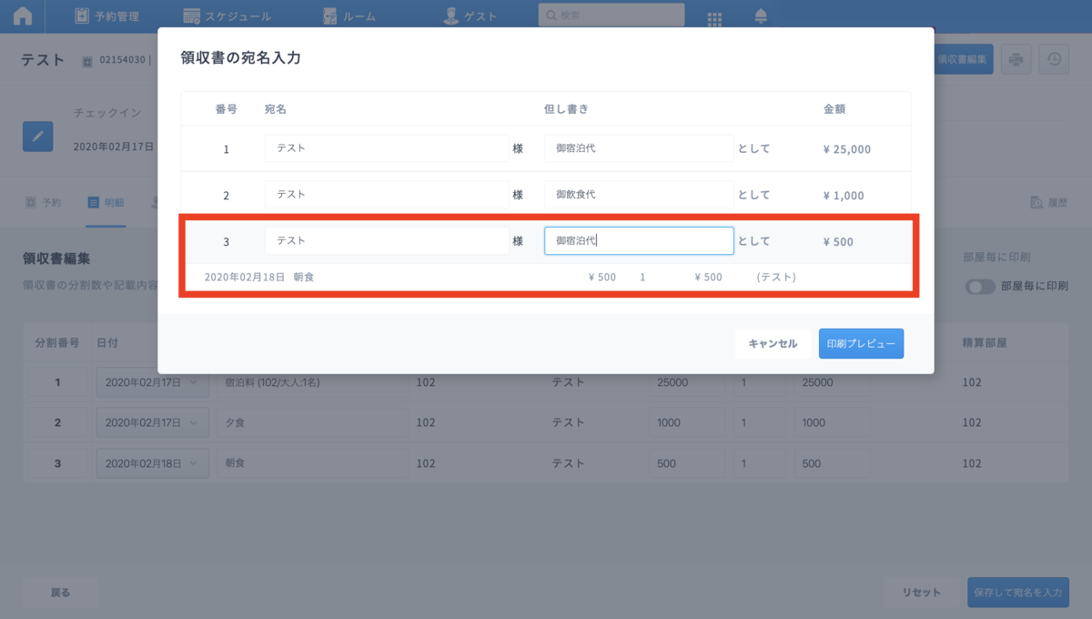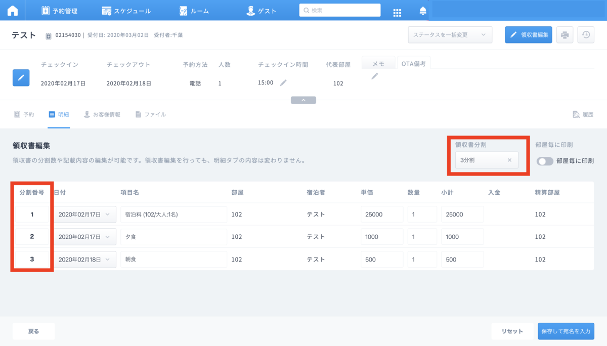 領収書編集にて設定した項目、分割に応じて、宛名入力の画面にて