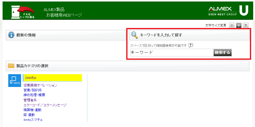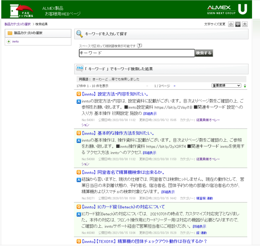 innto画面上部のボタンより、任意のキーワードで検索する事が出来る、