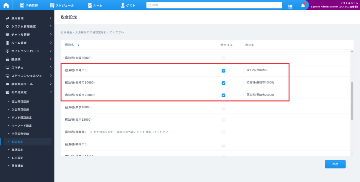 設定する税金科目が表示されますので、長崎市の宿泊税を選択し、保存を押して設定完了となります。
