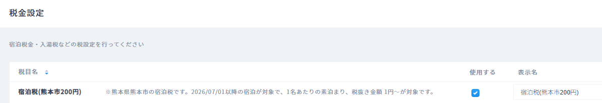 上記税金設定を行うことで、2026年7月1日以降の予約に対して、宿泊料金に応じて宿泊税が自動的に加算されます。