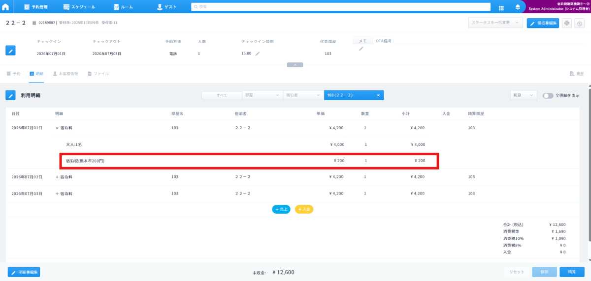 ※宿泊税科目の自動加算適用は本アップデート後・該当項目設定後に取り込んだ予約が対象となります。