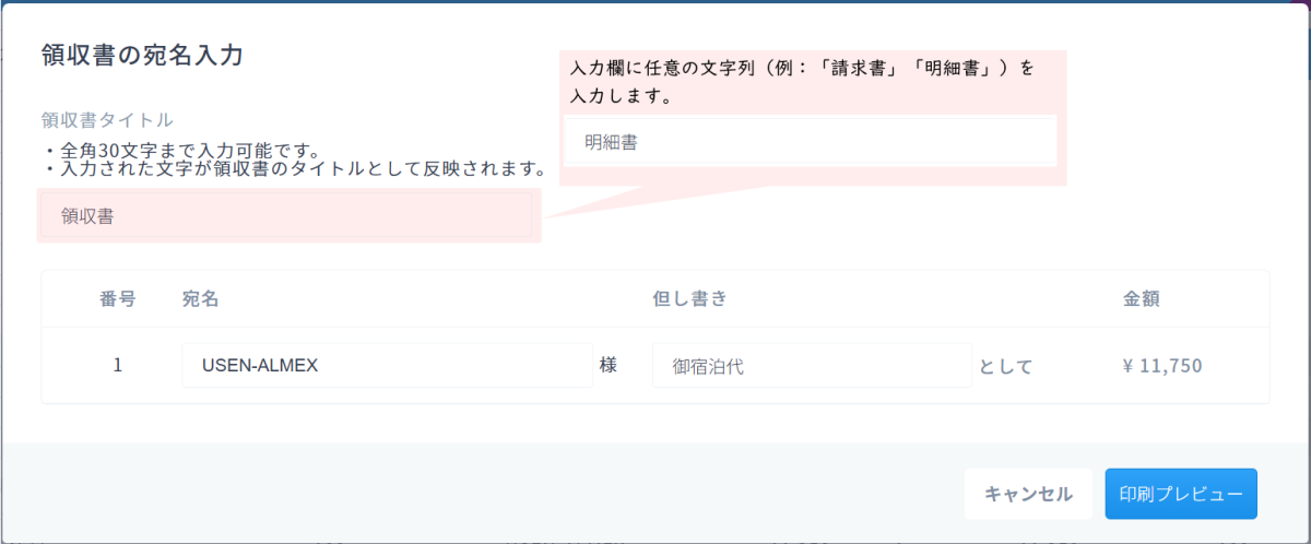 領収書の宛名入力画面に、タイトルを編集できる入力欄が追加されます。