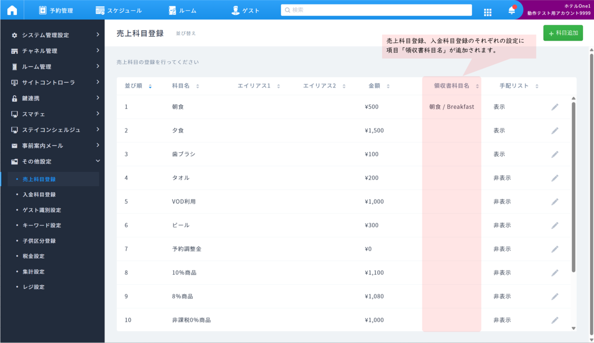 システム上で管理する科目名と、ゲストに発行する領収書に印字する科目名を分けて