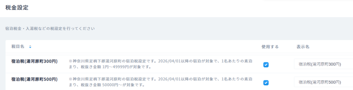 上記税金設定を行うことで、2026年4月1日以降の予約に対して、宿泊料金に応じて宿泊税が自動的に加算されます。
