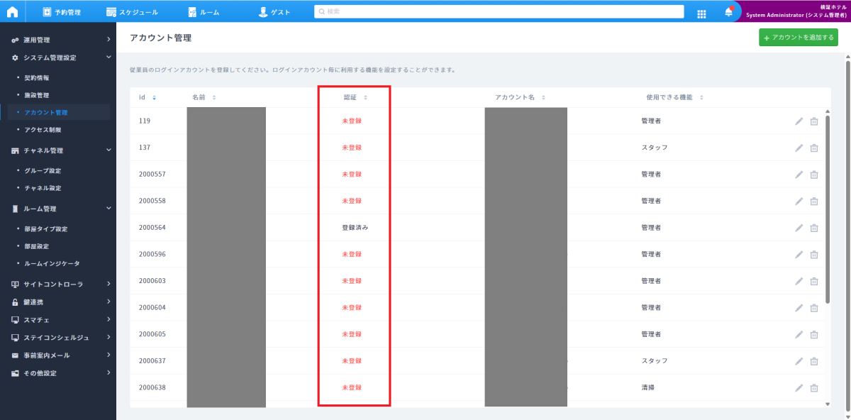 9.引き続き、施設内の全アカウントのメールアドレス認証および登録が完了するよう