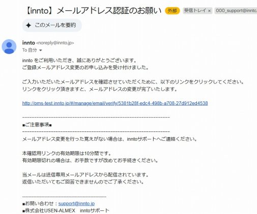 ・利用者本人がinntoログイン状態からメールアカウント登録対応を行う場合は、