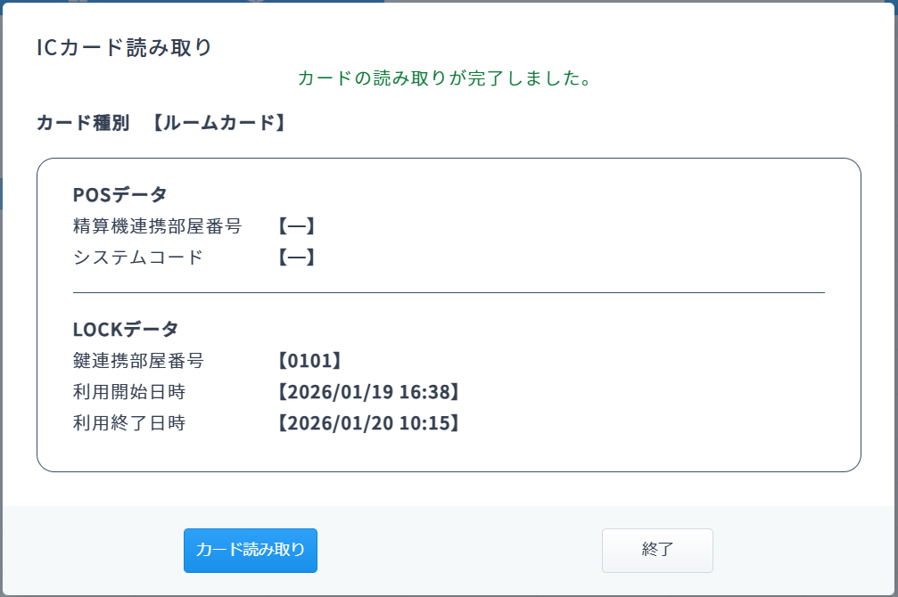 参考:ルームカードの読み取り時の画像サンプル(鍵発行プログラム最新更新後の動作)