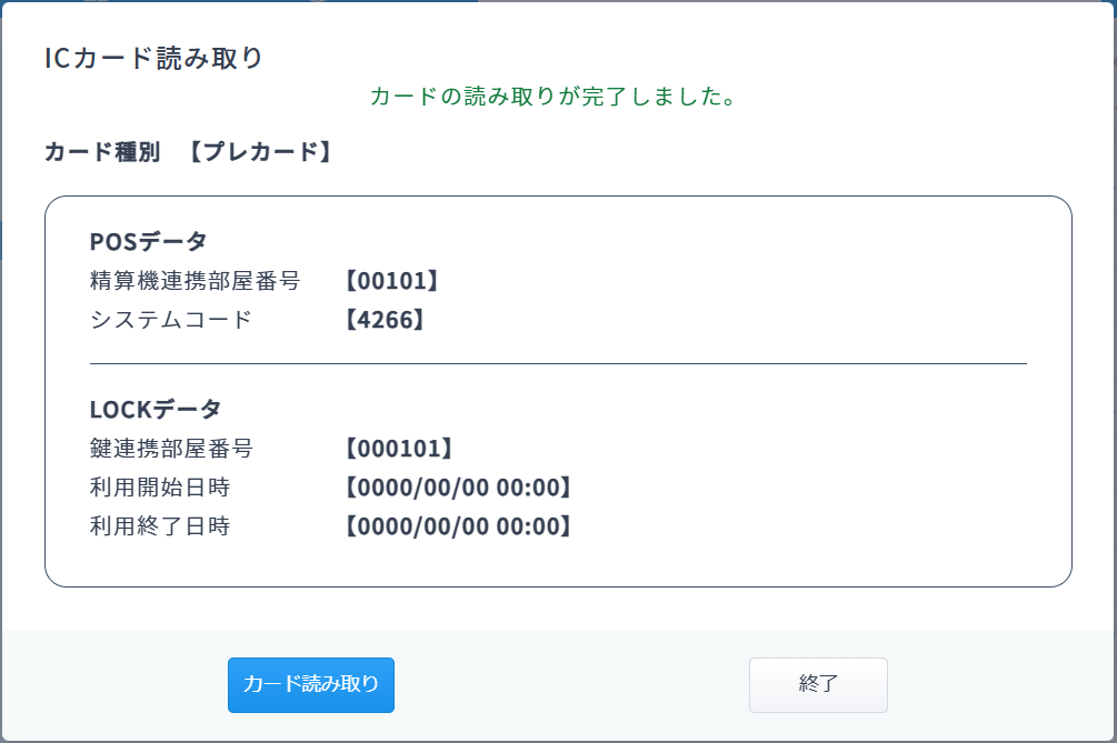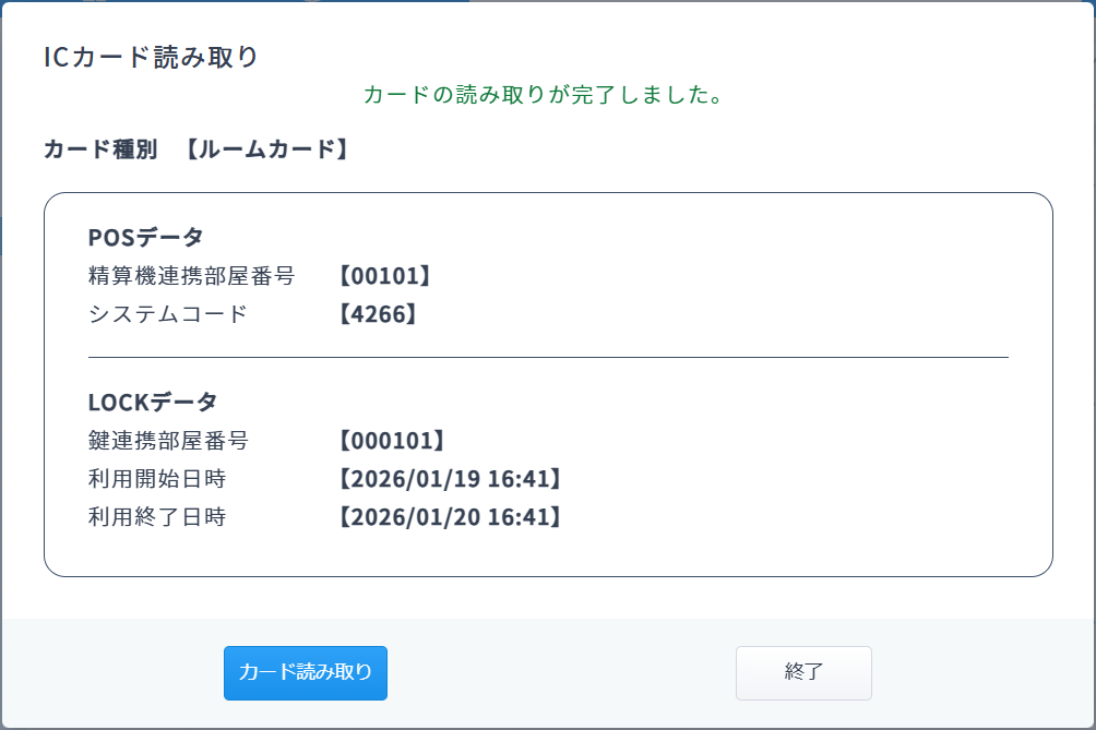 ※カード情報は、利用施設での鍵発行プログラムに設定された鍵メーカーデータに準じて読み取りします。