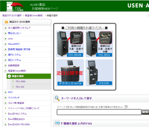 TEX-01K、TEX-2850A、TEX-2850といったinnto接続の自動精算機シリーズ(金銭デバイスを搭載している機種)に関する操作方法やトラブルシューティングをご覧いただけるようになります。